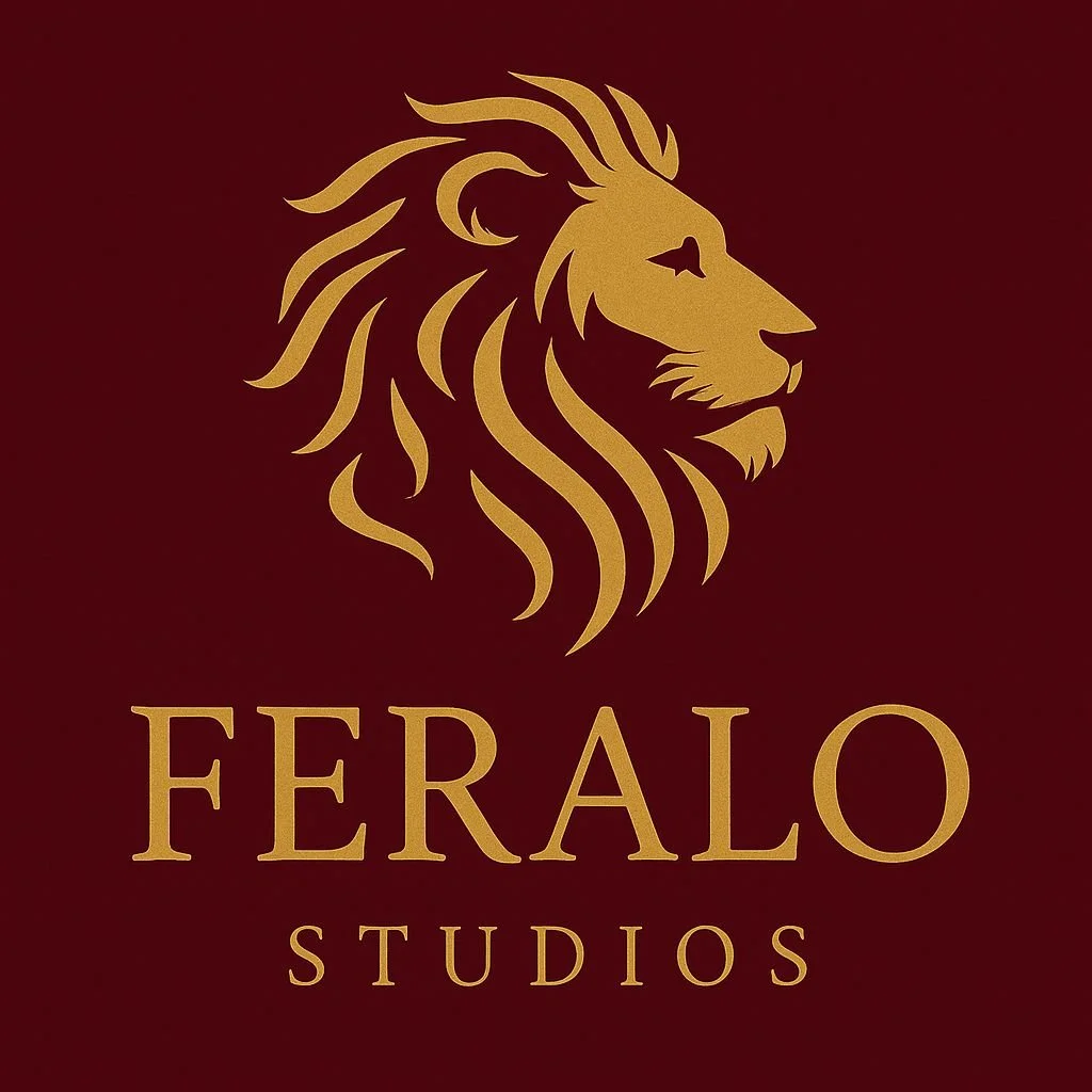 Gold silhouette of a lion's head with a flowing mane above the words "FERALO STUDIOS" on a dark red background.